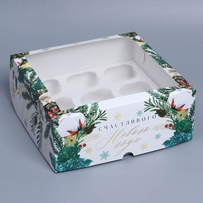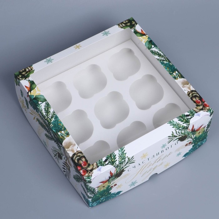 Коробка складная на 9 капкейков с окном «Счастливого Нового года», 25 х 25 х 10 см, Новый год