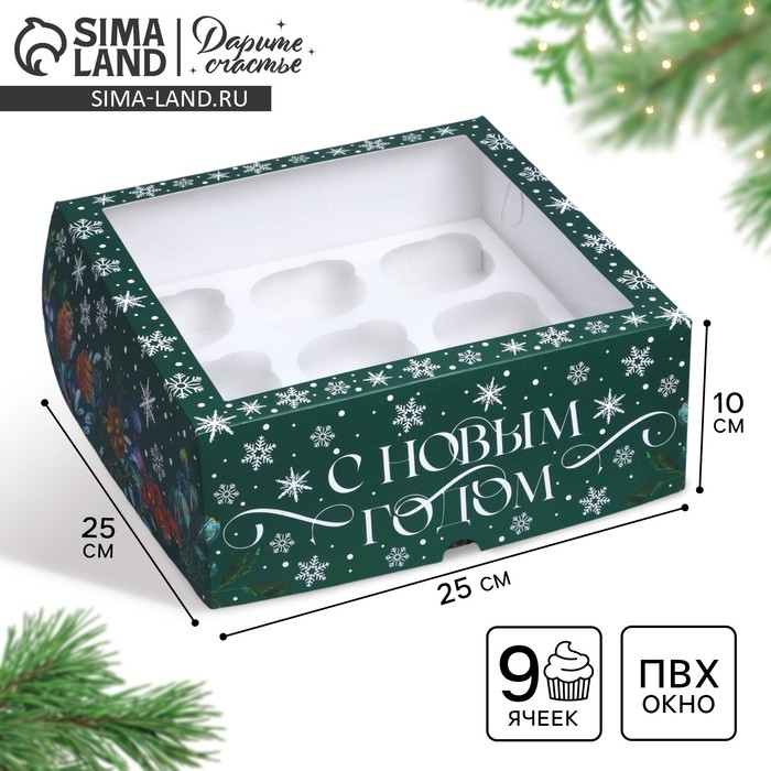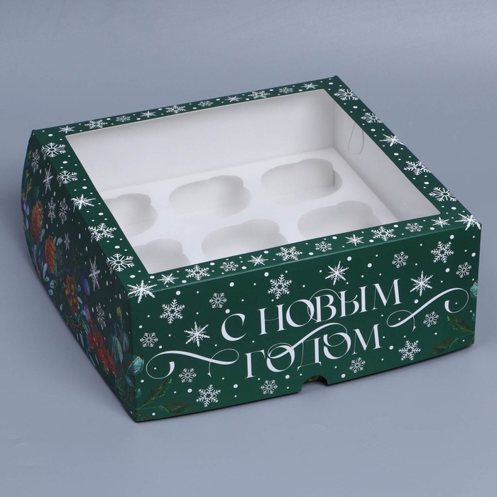 Коробка складная на 9 капкейков с окном «Зимний сад», 25 х 25 х 10 см, Новый год