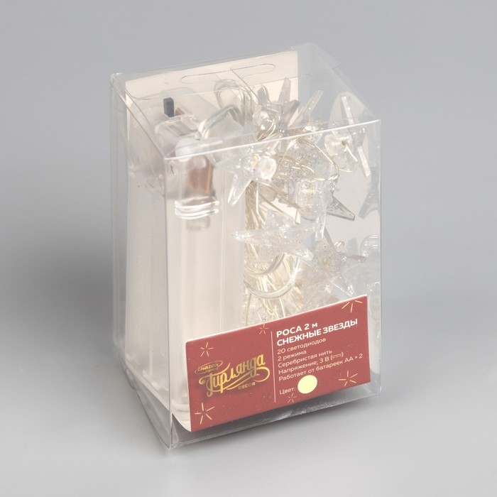 Гирлянда «Нить» 2 м роса с насадками «Снежная звезда», IP20, серебристая нить, 20 LED, 2 режима, батарейки ААх2 (нет в комплекте), свечение тёплое белое
