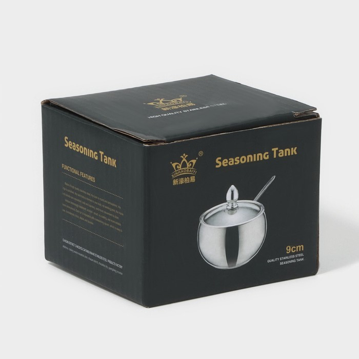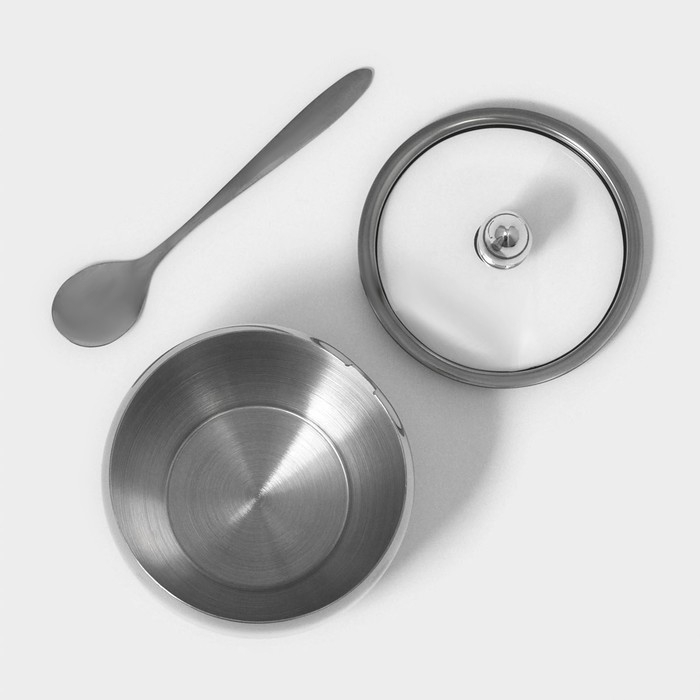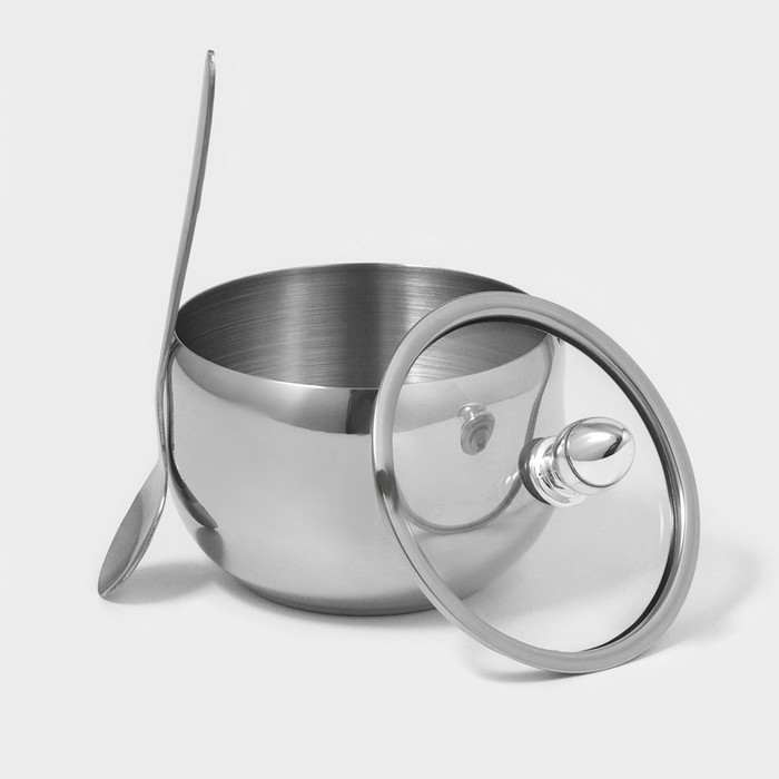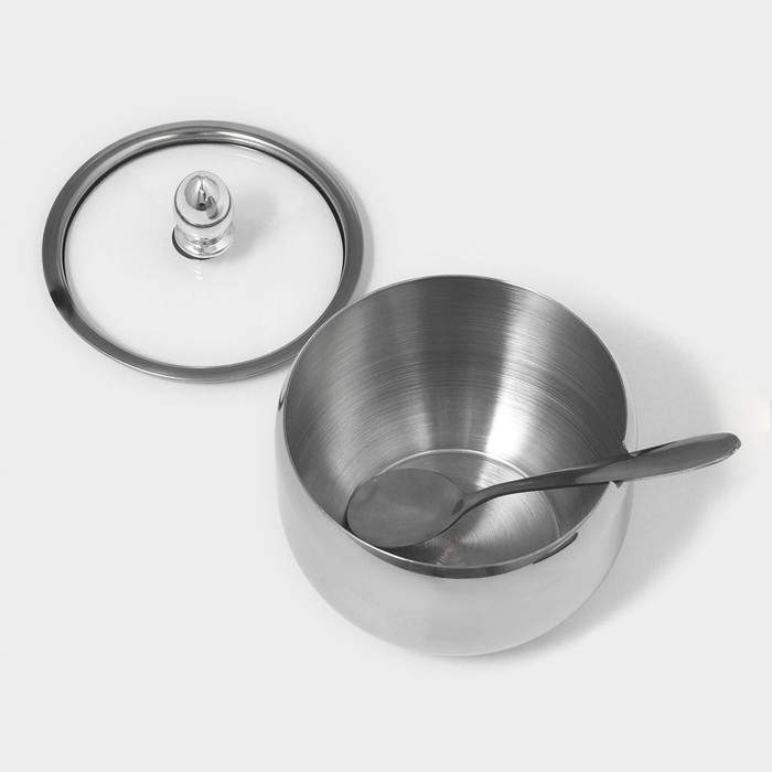 Сахарница из нержавеющей стали с крышкой и ложкой Доляна, 250 мл, 8,5×10 см, цвет серебряный