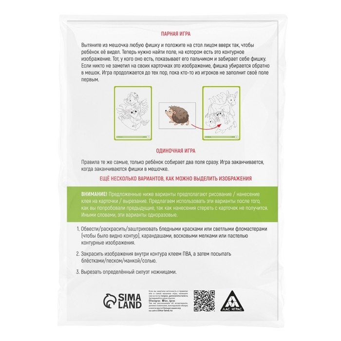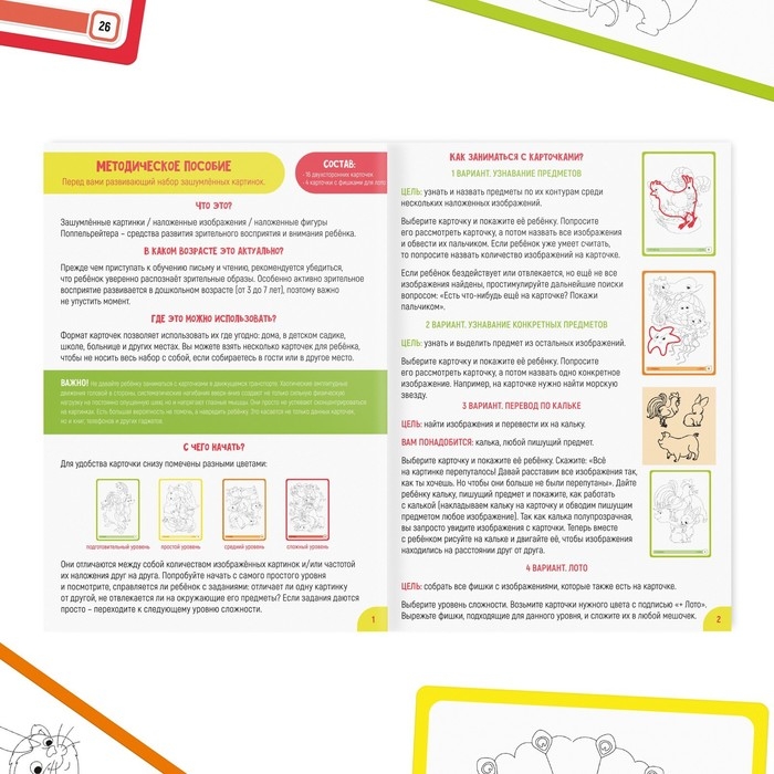 Внутри находится методическое пособие с 4 вариантами занятий (в том числе механика с лото), а также творческие варианты работы с карточками.