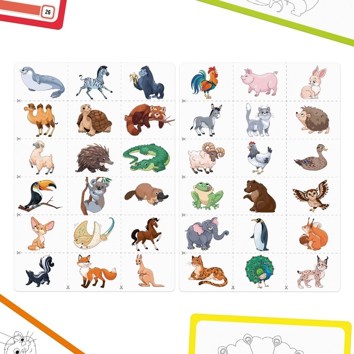 Для удобства карточки снизу помечены разными цветами, где: зелёный — подготовительный уровень; синий — простой уровень; фиолетовый — средний уровень; оранжевый — сложный уровень. Уровни отличаются между собой количеством изображённых картинок и/или частотой их наложения друг на друга.
