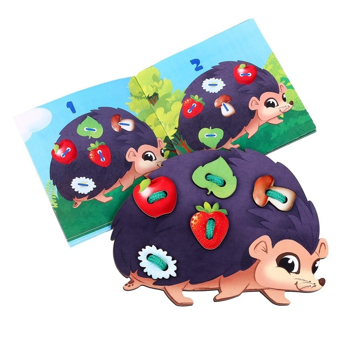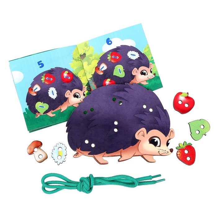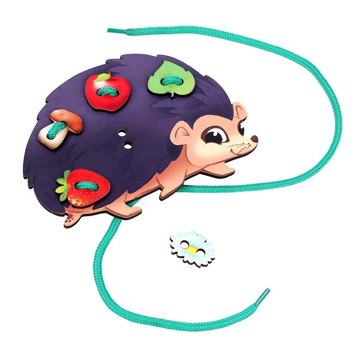 Деревянная шнуровка — увлекательная игрушка для тренировки мелкой моторики. Ёжику необходимо помочь собрать на иголки грибы, яблоки, груши, а это непросто сделать без детской помощи!