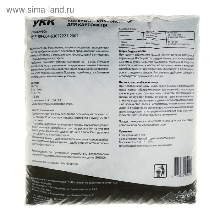 Меры предосторожности: удобрение комплексное УКК пожаро- и взрывобезопасно. По воздействию на организм относится к веществам IV класса опасности. Отравления исключены. При работе с удобрением необходимо соблюдать правила личной гигиены, использовать перчатки или защитные крема. При попадании пыли в глаза промыть чистой проточной водой. После работы вымыть руки с мылом и прополоскать рот. Освободившуюся тару утилизируют с бытовым мусором. Хранят удобрения в упакованном виде в сухом помещении отдельно от продуктов.