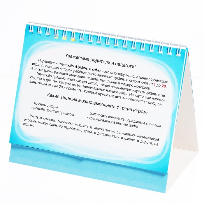 Перекидной тренажёр направлен на знакомство с цифрами и развитие навыков счёта. С помощью этой многофункциональной игры ребёнок потренирует мышление, мелкую моторику, память и внимательность.