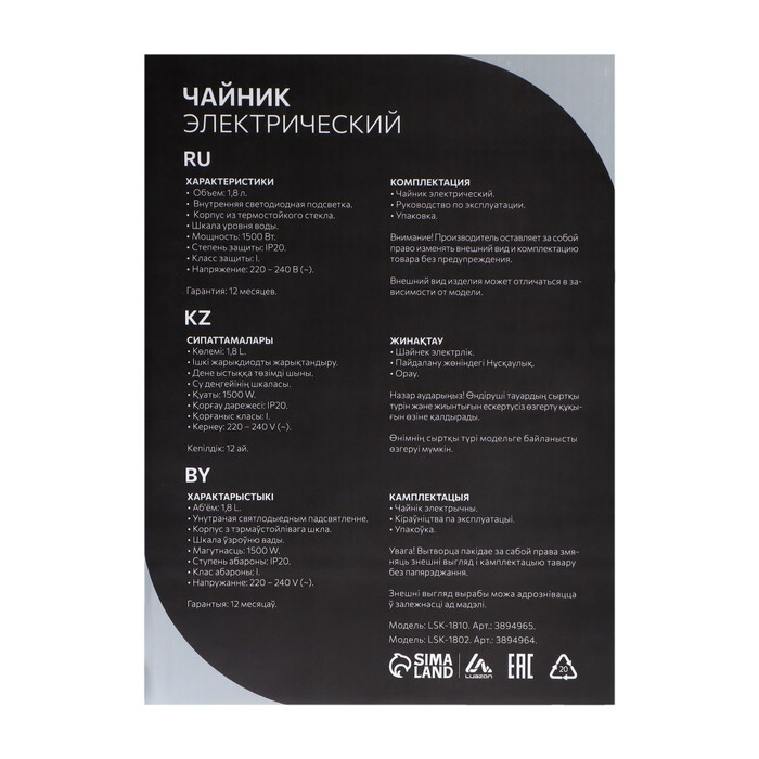 Чайник электрический LuazON LSK-1810 оснащён светодиодной подсветкой внутри. Корпус может вращаться на 360°. Имеет систему безопасного автоматического отключения. На корпус из термостойкого стекла нанесена шкала уровня воды.