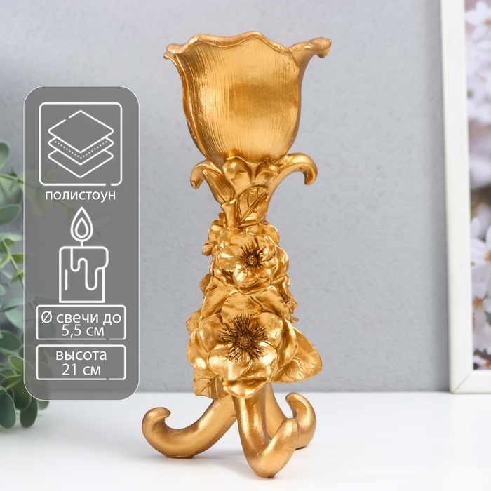 Подсвечник полистоун на 1 свечу "Цветочная тринога" золото 21х9,5х9,5 см