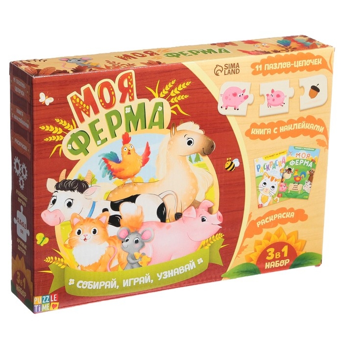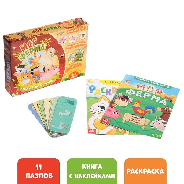 Набор 3 в 1 «Моя ферма»: 11 пазлов-цепочек, книга с наклейками, раскраска