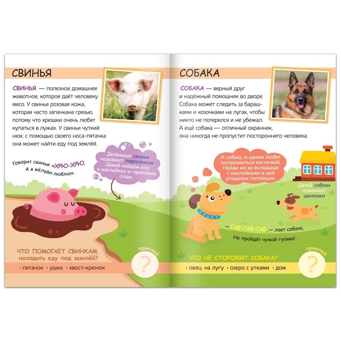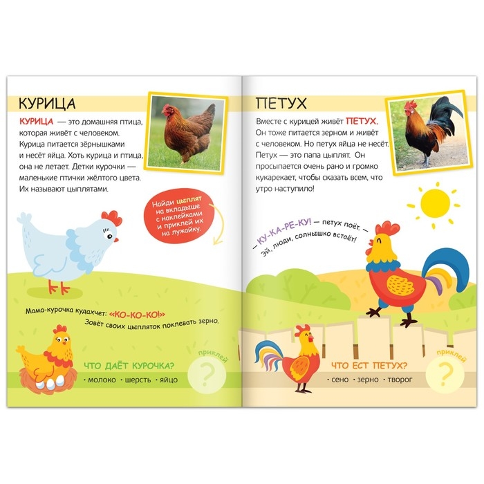 - Книга познакомит ребёнка с обитателями фермы. Под обложкой вас ждут красочные фотографии и увлекательные рассказы о животных. А ещё в книге есть интересные задания и наклейки для их выполнения.