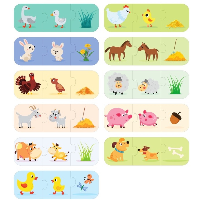 - Внутри коробки вы найдёте 11 пазлов-цепочек, книжку с наклейками и раскраску про обитателей фермы.