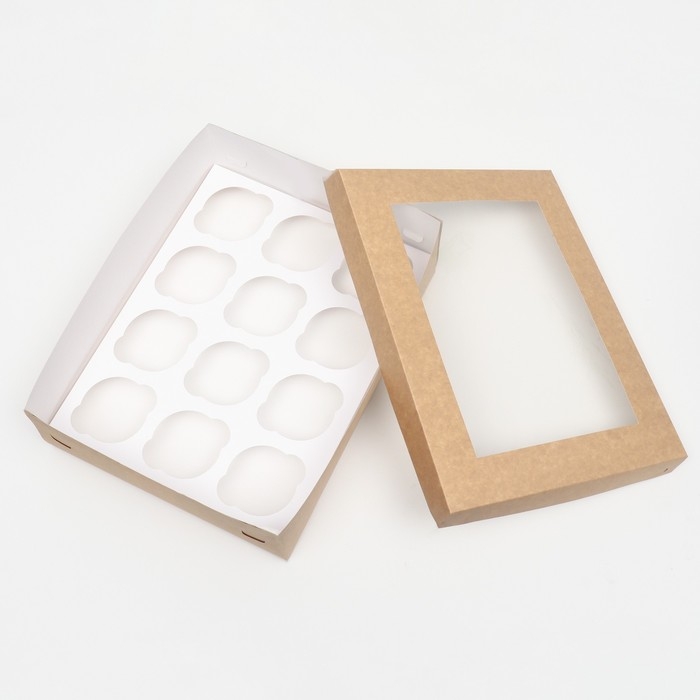 Коробка для 12 капкейков с окном, крафт, 32,5 х 25,5 х 10 см