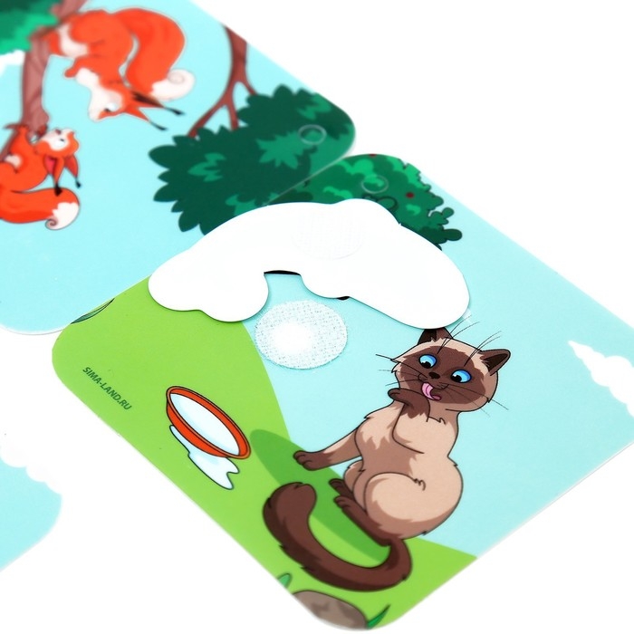 - В наборе вы найдёте 8 липучек с видами продуктов и 8 полей с разными животными и местами их обитания.