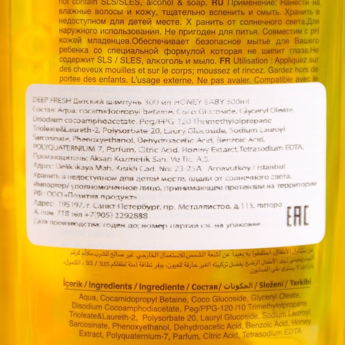 "Шампунь "Милый ребенок" не щиплет глазки. Его формула с экстрактом меда разработана специально для нежной детской кожи головы и волос. Значение pH совместимо с кожей вашего ребенка. Облегчает расчесывание, делает волосы мягкими и блестящими.