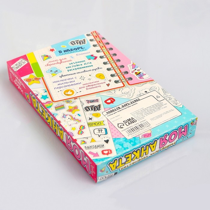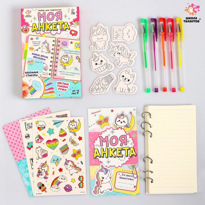 С таким набором девочка сможет оформить уникальную анкету, которую будет давать на заполнение своим друзьям. Скорее берите цветные ручки и начинайте разрисовывать титульную страничку и украшайте наклейками! Будет весело!