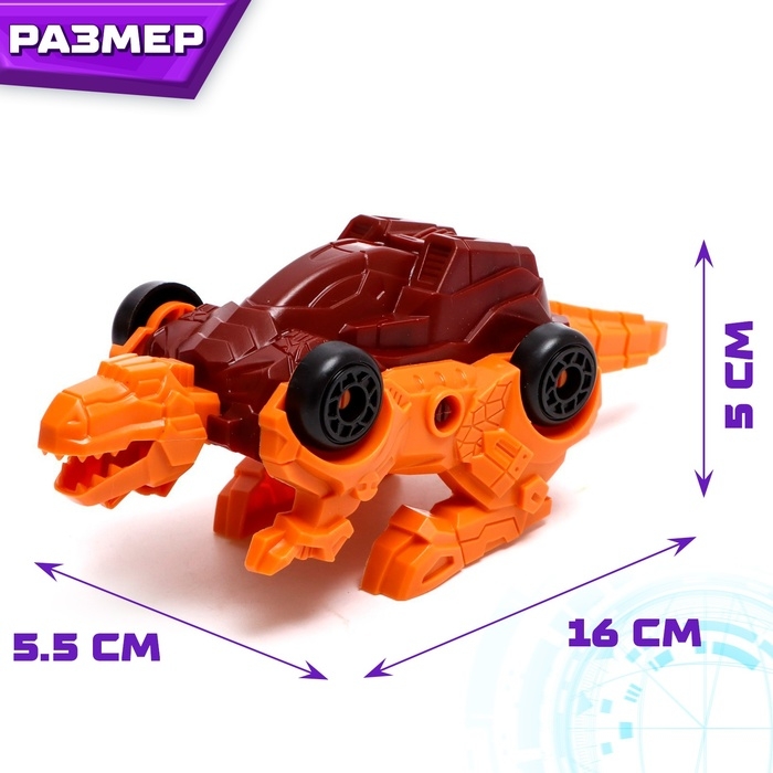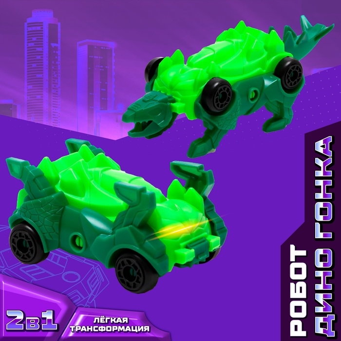 Робот «Дино-гонка» — воплощение силы хищника и скорости настоящего спорткара. Ребёнок сможет одолеть любого врага благодаря трансформации в хищного динозавра, а превращение в гоночный автомобиль сделает юного героя абсолютным чемпионом любых заездов.