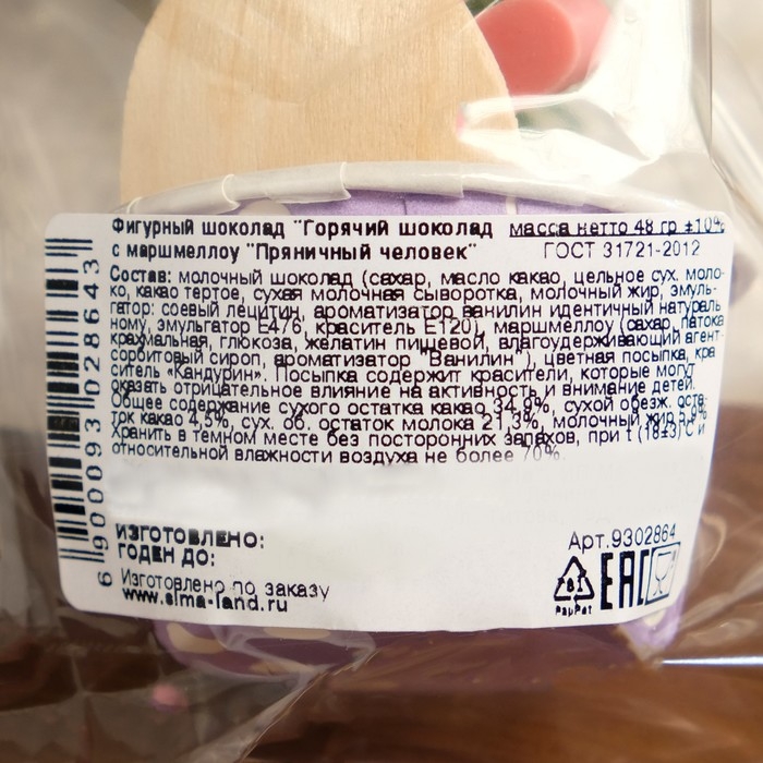 Новый год. Фигурный шоколад "Горячий шоколад с маршмеллоу "Пряничный человек", 48 г