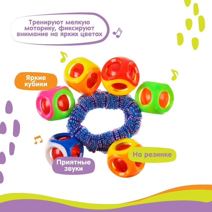 Звук в модели появляется при встряхивании. Причудливая форма надолго займёт внимание карапуза. Погремушку удобно использовать: лёгкая вещица подходит для захвата маленькими ладошками.