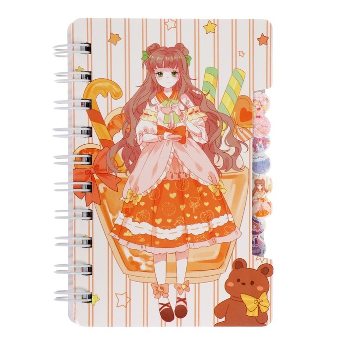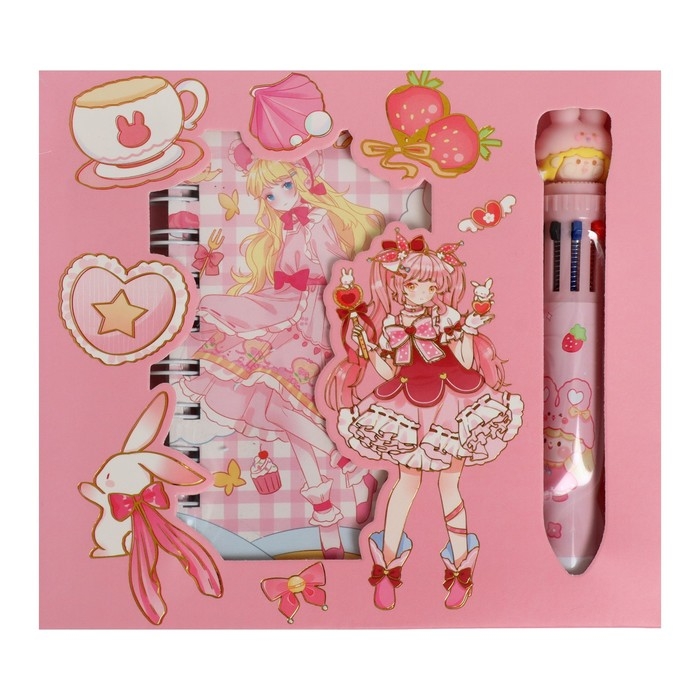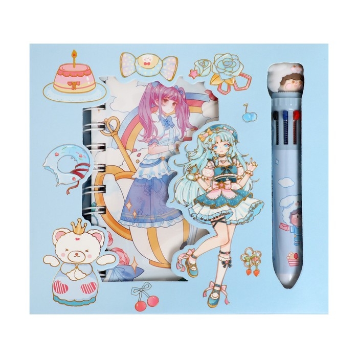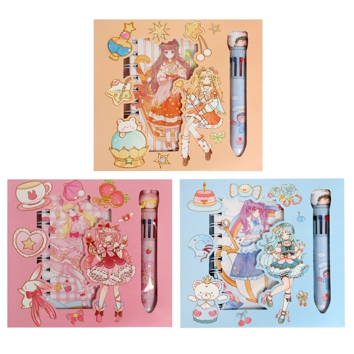 Записная книжка в подарочной коробке, А6, 50 листов, ручка шариковая 10-цветов "Аниме", МИКС
