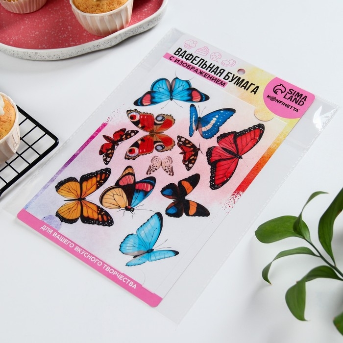 Вафельные картинки съедобные «Бабочки» для капкейков, торта KONFINETTA, 1 лист А5