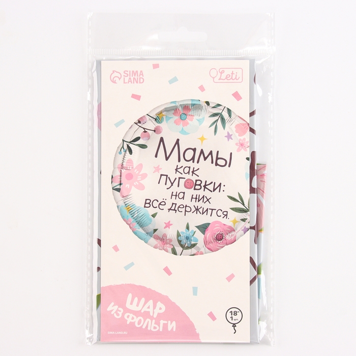 Шар из фольги в форме круга с надписью: «Мамы как пуговки: на них всё держится» оформлен в нежных тонах и на нём изображены разные цветы. Подойдёт в качестве дополнения к подарку для мамы на День рождения, 8 Марта, День матери или любой другой праздник. Оформите помещение несколькими шарами и устройте сюрприз.