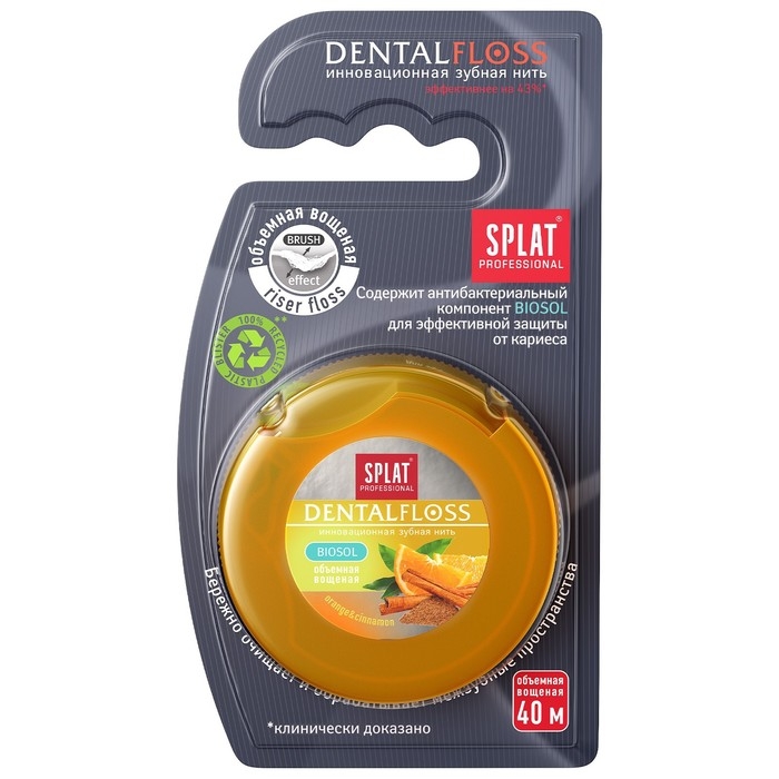 Попробуйте цитрусовую новинку SPLAT - вощеную объемную зубную нить Dental Floss с ароматом апельсина и корицы! Нить пропитана антибактериальным компонентом Biosol. Поэтому она не только механически очищает межзубные промежутки от остатков пищи, но и защищает зубы от кариесогенных бактерий. Волокна нити распушаются по технологии RiserFloss во время использования и бережно обрабатывают всю поверхность зуба, даже скрытую под десной.