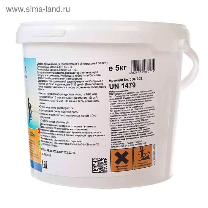 Химические мульти-таблетки на основе хлора "Все-в-одном" от производителя Chemoform специально разработаны для обеспечения дезинфекции воды. Используются для длительной флокуляции, дезинфекции и уничтожения водорослей в бассейне. Средство содержит трихлоризоциануровую кислоту и активный хлор 80%.