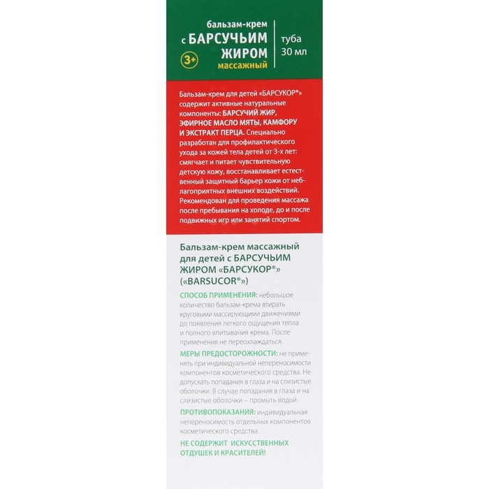 Бальзам, созданный на основе натурального барсучьего жира, обеспечивает мягкое глубокое прогревание мышц и длительное сохранение тепла, что помогает ускорить выздоровление ребенка при простуде и сократить проявление ее симптомов. Активизирует микроциркуляцию крови. Насыщает витаминами А, В2, В5, В6, В12, K, PP и микроэлементами.