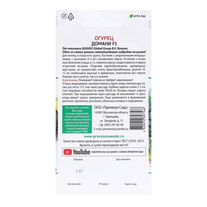 Семена Огурец "Домани F1 (IKASIDO Global Group B.V. Япония)", 5 шт.
