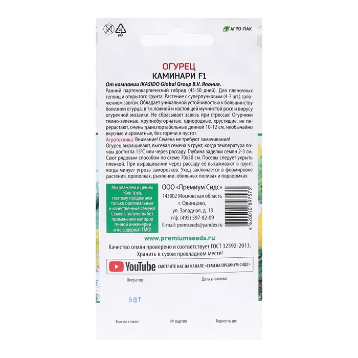 Семена Огурец Герман F1, партенокарпический, 5 шт