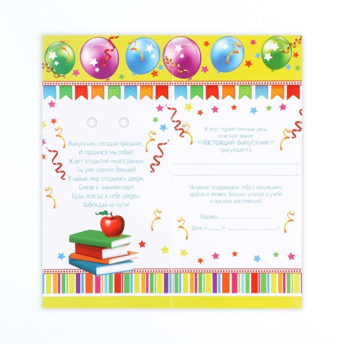 Выпускной - это особое событие для каждого ребёнка. Сувенир изготовлен из лёгкого пластика и декорирован яркой текстильной лентой. Изделие дополнено булавкой на оборотной стороне, так что его сразу можно надеть на счастливого получателя. Каждый значок на булавке с лентой прикреплен к яркой, нарядной подложке - открытке, ребенку будет вдвойне приятно получить такой презент