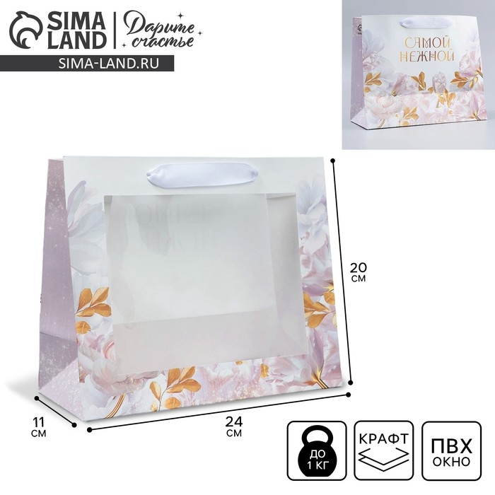 Пакет подарочный крафтовый с пластиковым окном, упаковка, «Самой нежной», 24 х 20 х 11 см