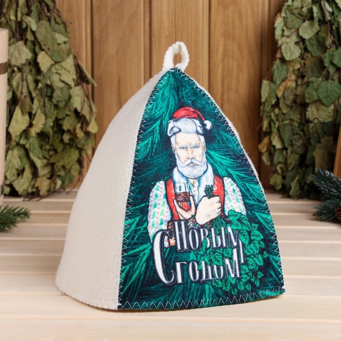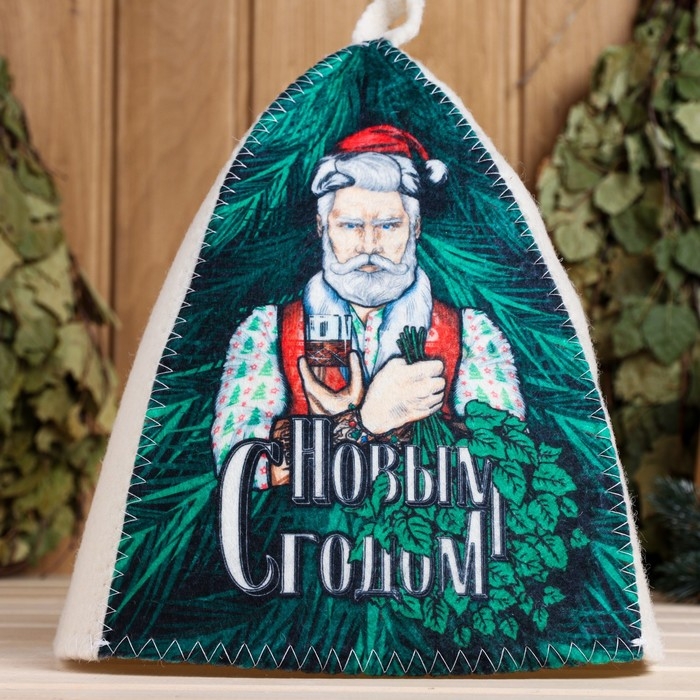 Шапка для бани"С Новым Годом! (Дед Мороз с веником и бокалом)" принт
