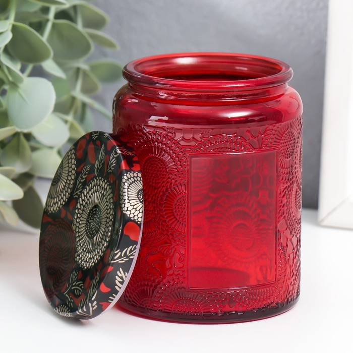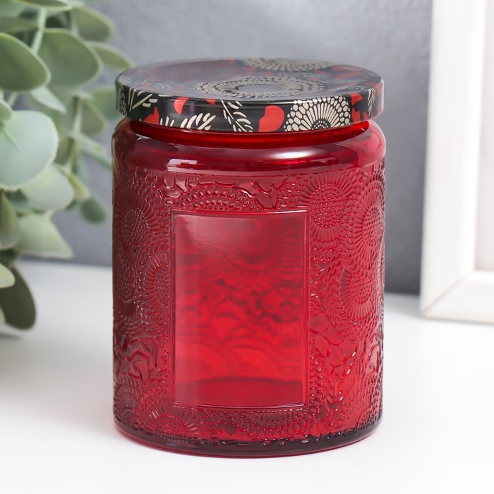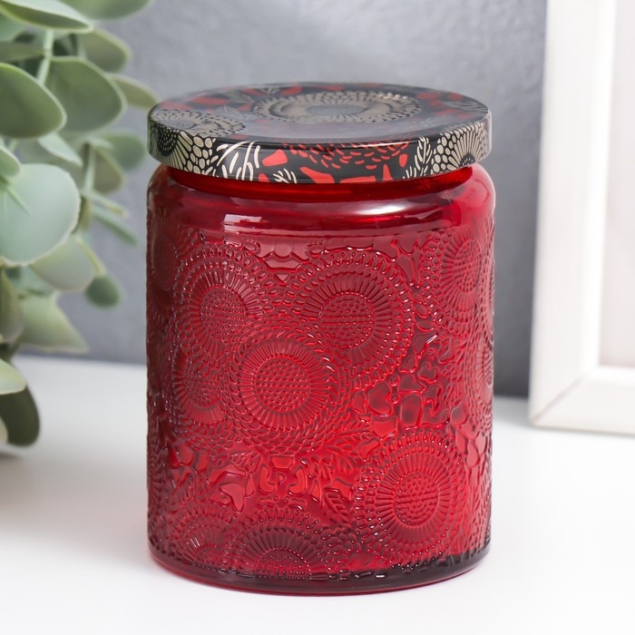 Банка для свечей стекло с крышкой "Цветочная" красная, цилиндр 9х7х7 см