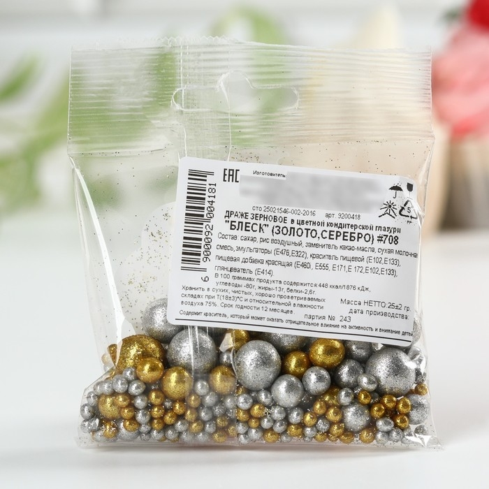 Посыпка кондитерская «Блеск» мягкая и с шоколадом: золото и серебро, 25 г.