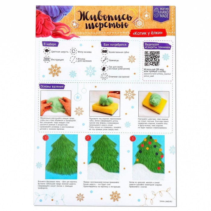 Данный вид творчества основан на валянии. Никогда не слышали о такой технике? Это не проблема: создать мягкое и пушистое панно вам помогут подробные инструкции и видео-мастер-класс, входящие в набор.