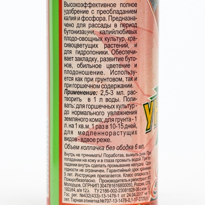 Полное удобрение с преобладанием калий-фосфорной компоненты. Стимулирует бутонизацию, цветение, созревание плодов и семян. Предназначено для периода бутонизации и цветения рассады овощных культур и для цветущих или плодоносящих декоративных культур. Жидкие минеральные удобрения принципиально отличаются от аналогичных органических или гуминовых удобрений тем, что концентрация действующих веществ в минеральном удобрении может быть достигнуто в несколько раз выше, чем в органических.