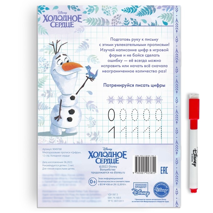 Многоразовые прописи «Цифры», 12 стр., 17 × 24 см, Холодное сердце