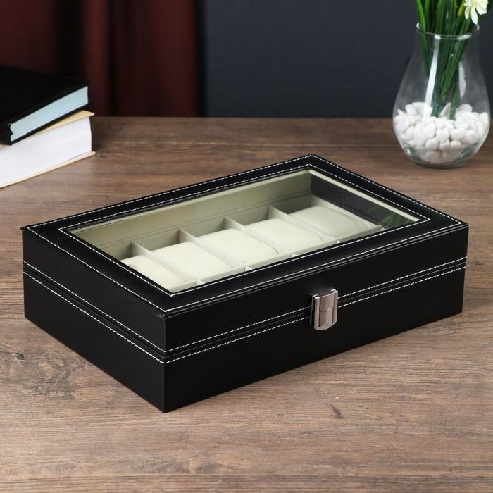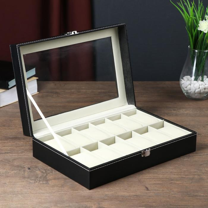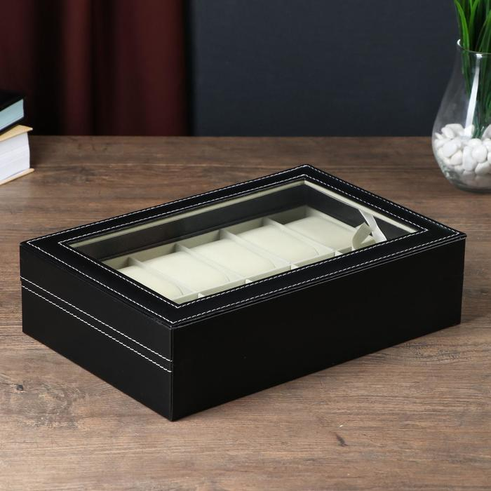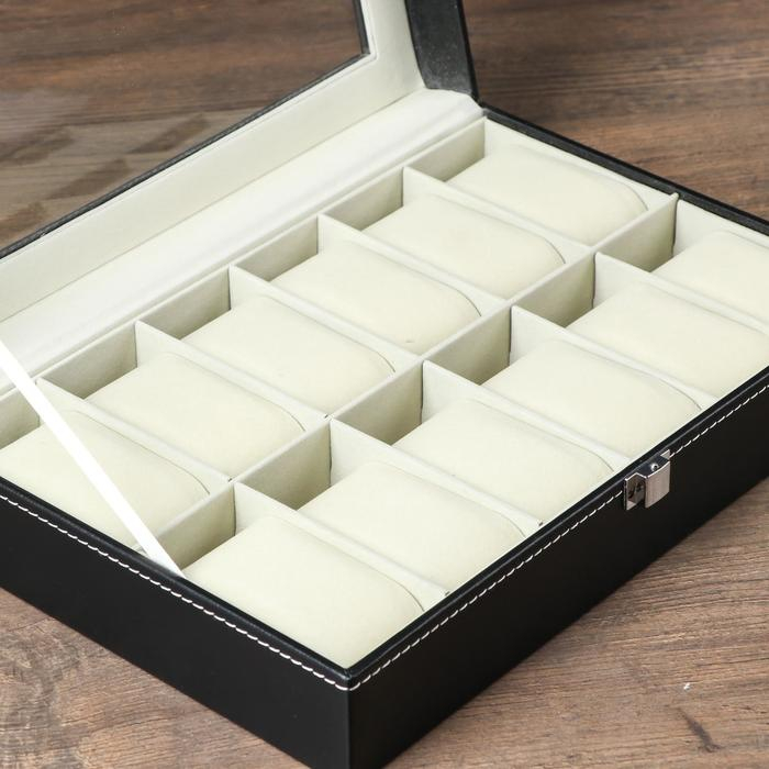 Шкатулка кожзам под часы 12 отделений "Чёрная с белой строчкой" 30х20х8,2 см