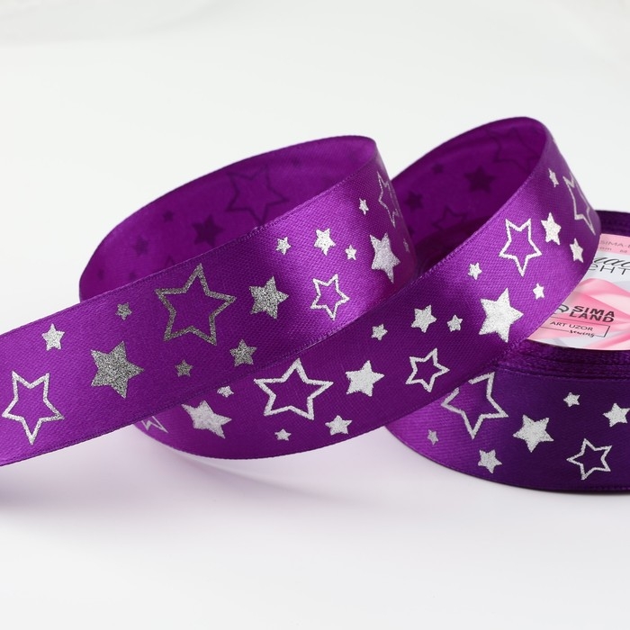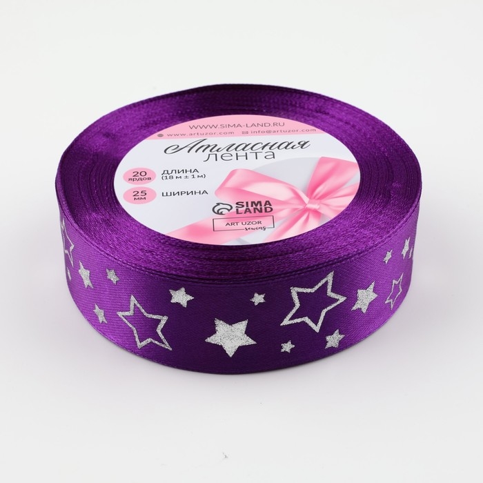 Лента атласная с тиснением «Звёзды», 25 мм × 18 ± 1 м, цвет фиолетовый/серебряный №145