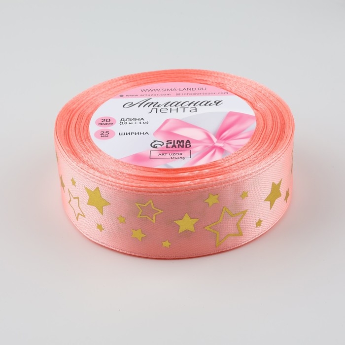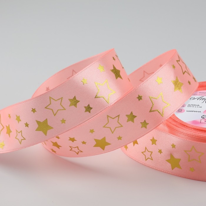 Лента атласная с тиснением «Звёзды», 25 мм × 18 ± 1 м, цвет розовый/золотой №089