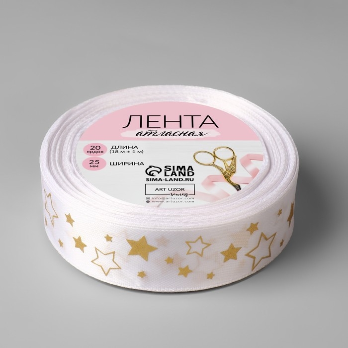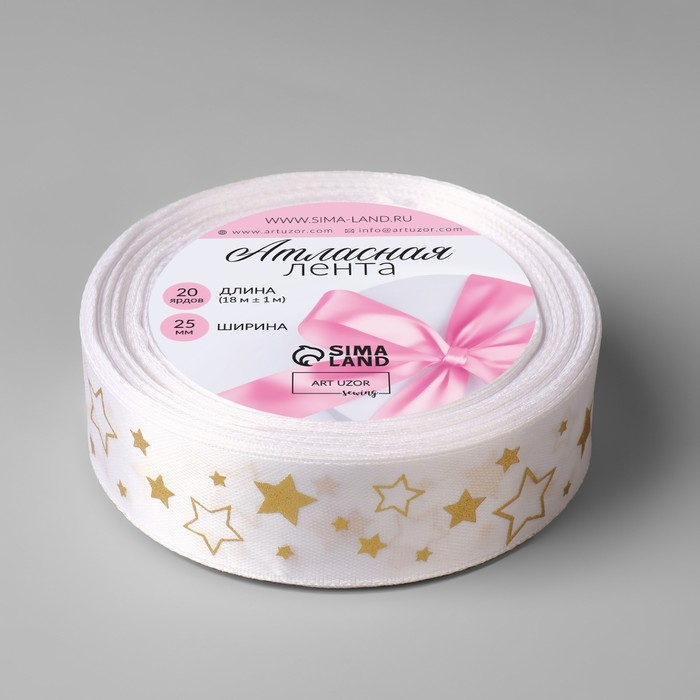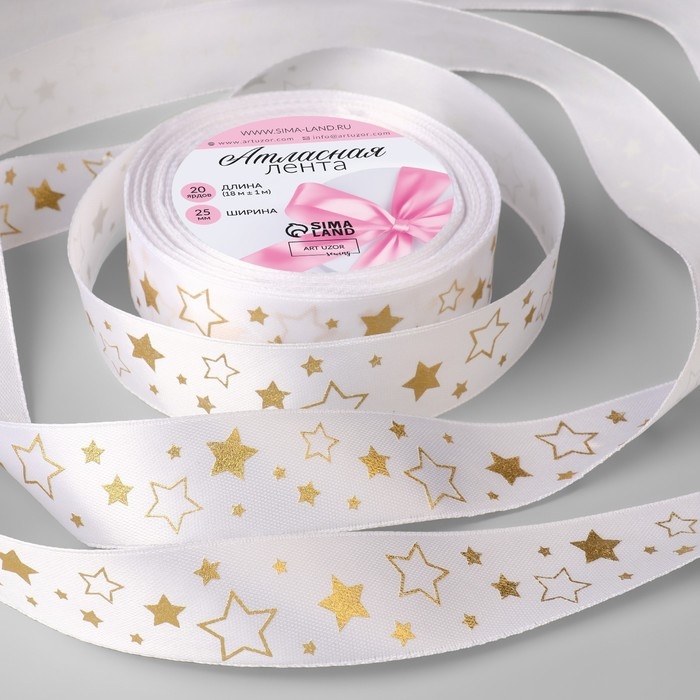 Лента атласная с тиснением «Звёзды», 25 мм × 18 ± 1 м, цвет белый/золотой №001