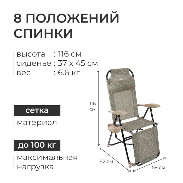 Конструкция изделия предполагает два положения на выбор: сидя и полулёжа. Вы сможете наслаждаться посиделками за столом, в кругу любимых друзей, и принимать солнечные ванны на своём участке или в любом удобном месте. Благодаря восьми положениям спинки вы настроите комфортный для вас угол наклона.