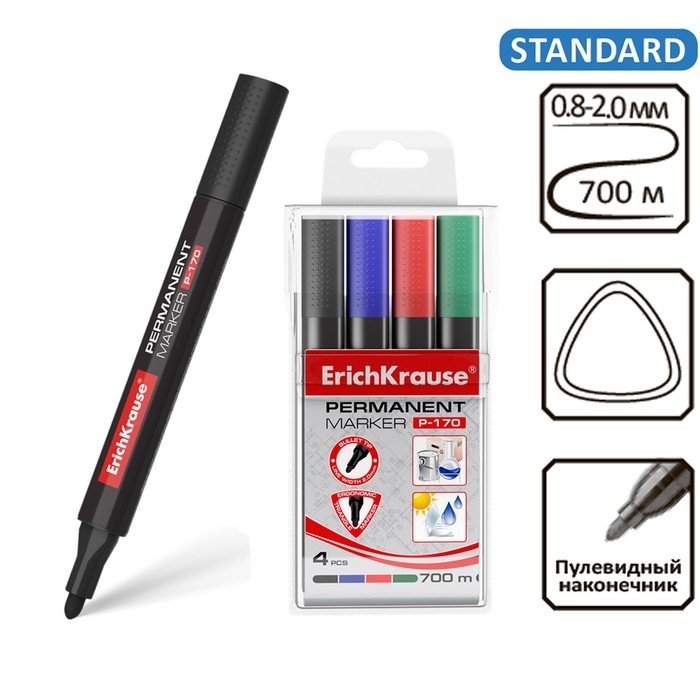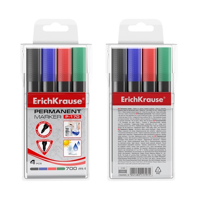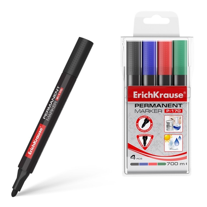 Набор маркеров перманентных ErichKrause P-170, 4 штуки, 2.0 мм, чернила на спиртовой основе, чёрный, синий, красный, зелёный