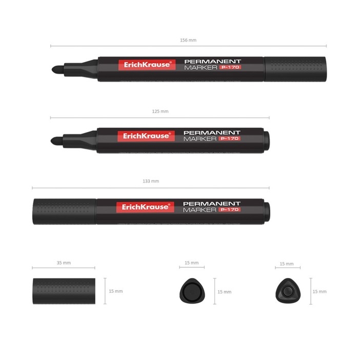 Перманентный маркер с наконечником пулевидной формы. Предназначен для письма и маркировки практически на всех поверхностях: бумага, картон, стекло, пластик, фарфор, дерево и др. Имеет эргономичную трехгранную форму корпуса и цветной колпачок. Цвет колпачка соответствует цвету чернил. Наконечник устойчив к повреждению и истиранию.Толщина письма - 2.0 мм. Чернила на спиртовой основе, водостойкие, светостойкие, устойчивые к ультрафиолетовым лучам, быстро высыхают после нанесения. Не токсичны. Не содержат ксилол, толуол. Срок годности 5 лет. Максимальная длина непрерывной линии 700 м.
