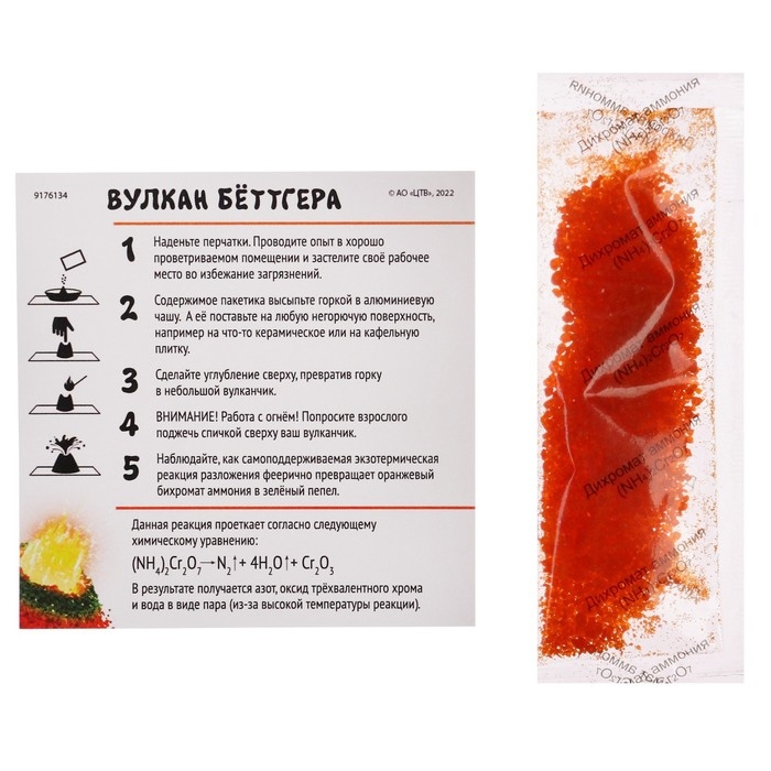 - Наблюдайте, как самоподдерживаемая экзотермическая реакция разложения феерично превращает оранжевый бихромат аммония в зелёный пепел.