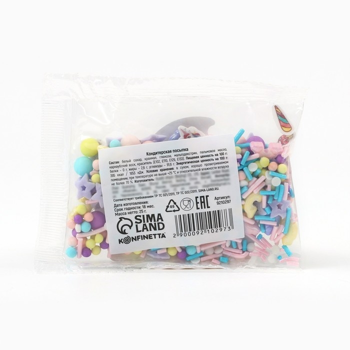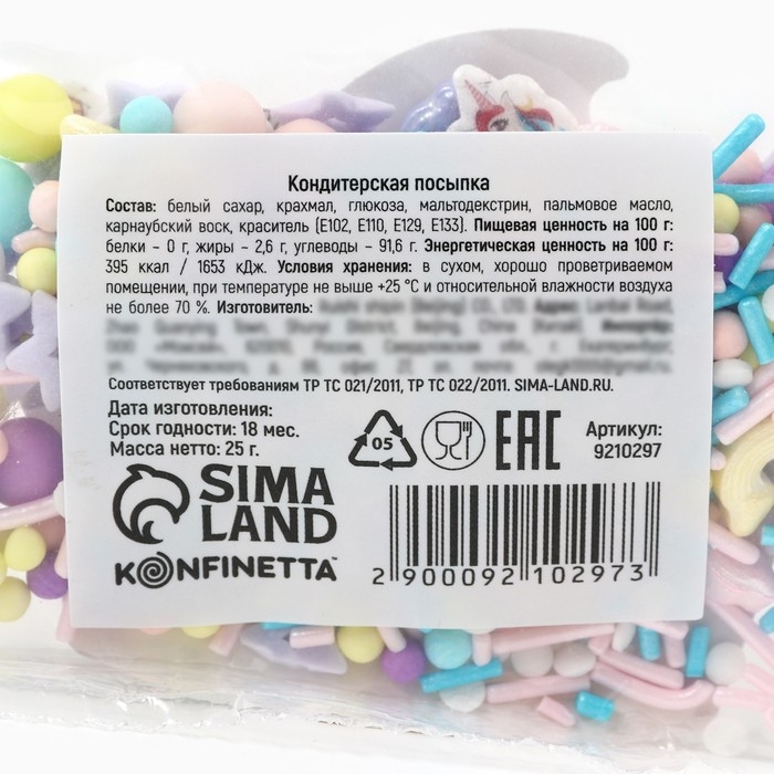 Состав: белый сахар, крахмал, глюкоза, мальтодекстрин, пальмовое масло, карнаубский воск, краситель (Е102, Е110, Е129, Е133).