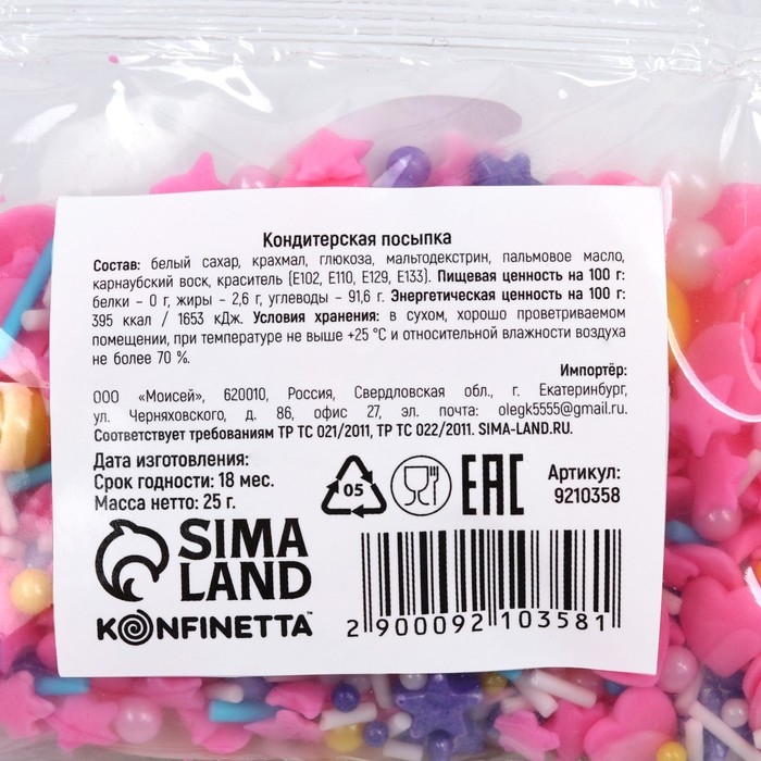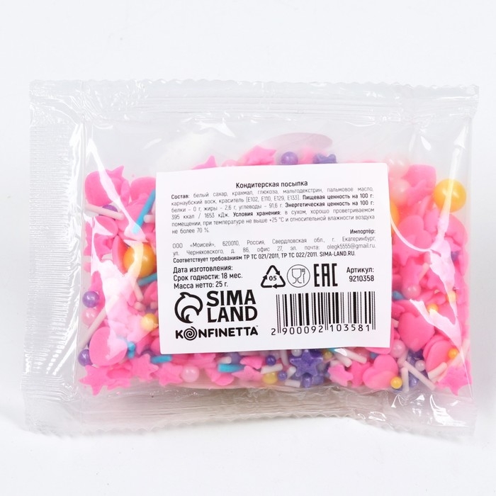 Посыпка кондитерская фигурная «Сердечки»: розовая, фиолетовая, жёлтая, 25 г.