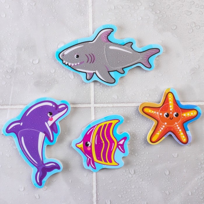 Забавные игрушки из мягкого материала не тонут в воде и при намокании приклеиваются к кафелю или ванне.