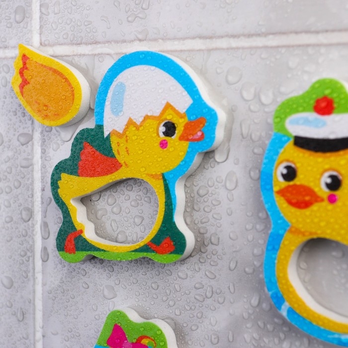 Забавные игрушки из мягкого материала не тонут в воде и при намокании приклеиваются к кафелю или ванне.
