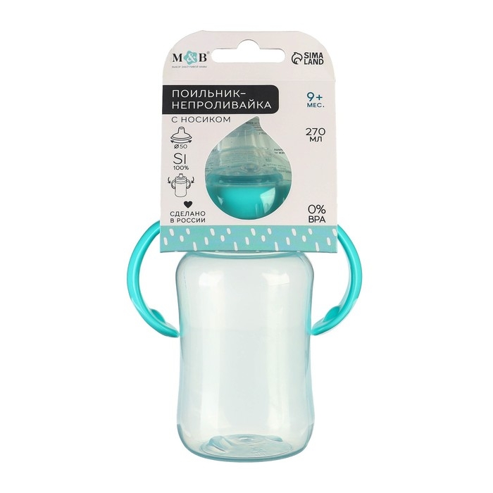 Поильник - непроливайка детский с мягким носиком, 270 мл., с ручками, цвет бирюзовый
